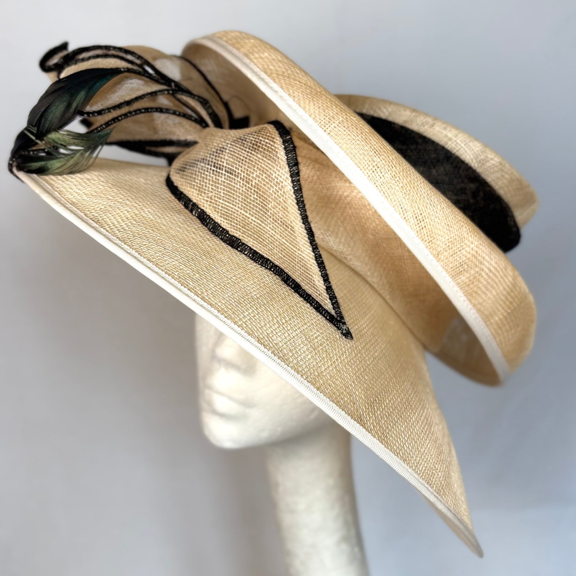 Statement bold headpiece with double brim and structured flower design in classic cream and black