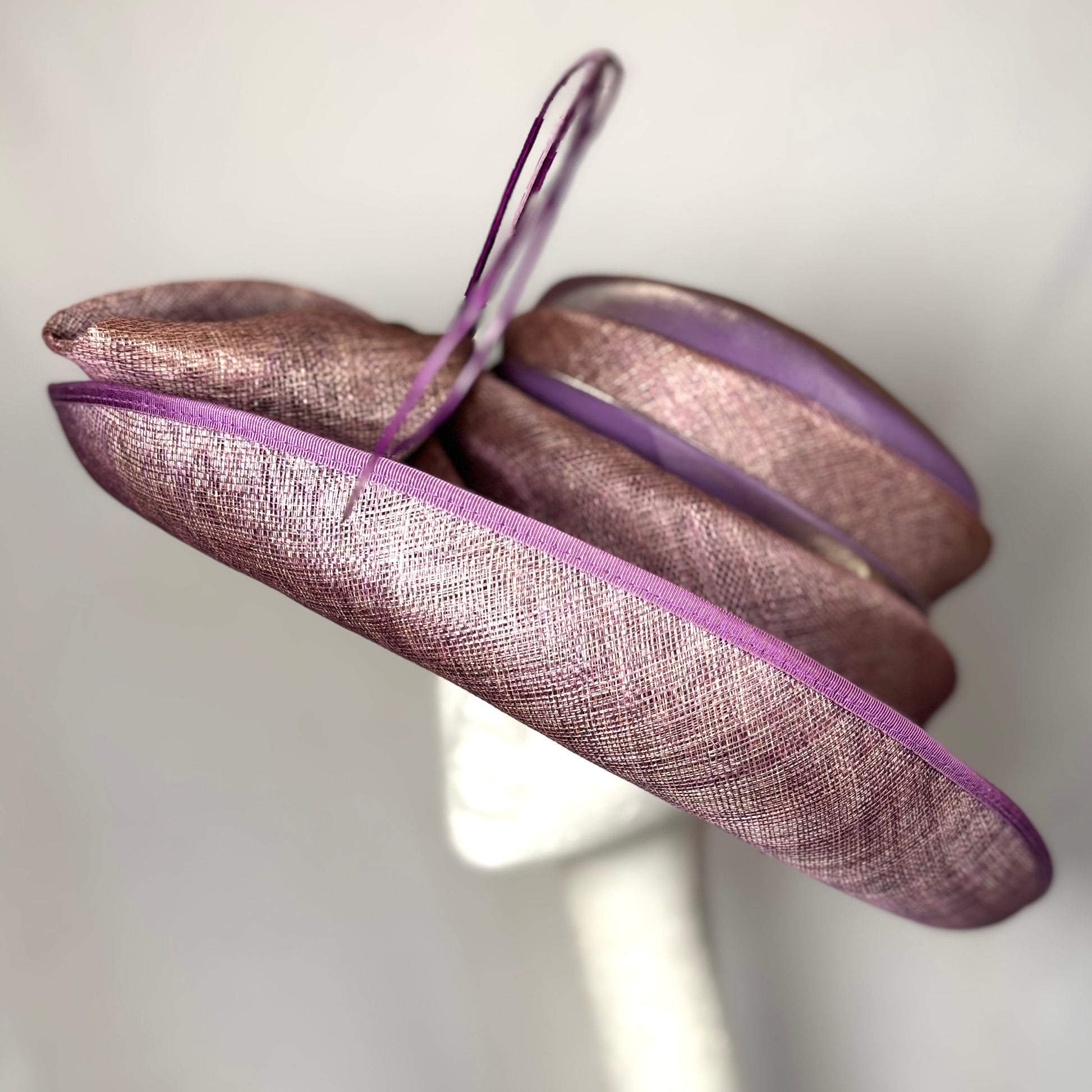 Simply stunning elegant wide-brim hat in layered two tone with feature bow detail. Soft purple with light bronze detail.